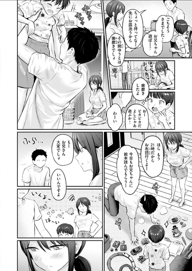 「やっぱり していい?」バイト先でシングルマザーの深川(ふかがわ)さんと仲良くなり、週に何回か夜ご飯を食べさせてもらっている大学生の俺。申し訳ないとは思いつつも、子どもと遊ぶのも楽しくてついつい厚意に甘えてしまう日々を過ごしていた。そんなある日、子どもを寝かしつけ、2人で話しているとお酒の入った深川さんから女っ気のない自分に「練習相手になってあげようか?」 と提案される。からかわれたと思い、その場は断るも、深川さんは本気だったみたいで……。欲求不満なシンママと童貞卒業中出しナマSEX――