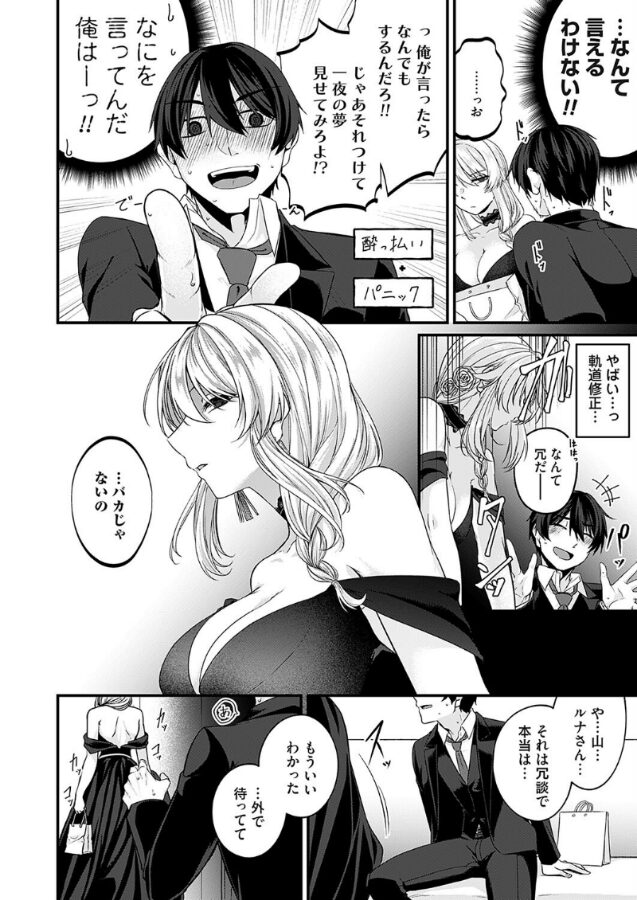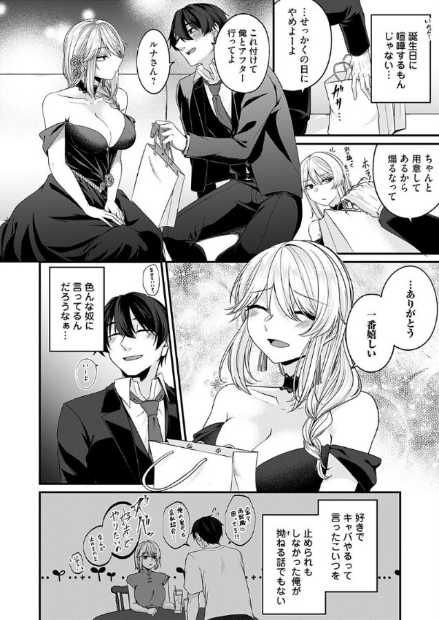 今日だけは、一夜の夢を見せてよ──。きっかけは大人のおもちゃ!?幼馴染キャバ嬢の生誕祭で渡した誕プレで二人は急接近!!??毎年恒例の山瀬茉莉(やませ・まつり)の誕生日を祝いに、真田真司(さなだ・しんじ)はキャバクラへ足を運ぶ。キャバ嬢として活躍し、他の男から祝われる茉莉の姿を見てむなしくなる。今年も無事にラストを取れたものの、不満げな真田に茉莉もイライラ。機嫌を取るように誕生日プレゼントを渡し真田はアフターに誘う。しかし、帰ってからオナニーに使う予定だったローターとエネマグラを間違って渡してしまい!?「それつけて一夜の夢を見せてみろよ!?」とち狂った真司はさらに罪を重ねる。冷徹な目で見下した茉莉が席を離れ、そのままお店は閉店してしまう。アフターのため項垂れながら真司は外で待つ。そこに現れた、股間をモゾモゾさせ切なげな顔を浮かべた茉莉。本当にローターをつけた彼女は、真司も一緒につけてお店へ行くこと。個室で二人は静かに熱く互いにおもちゃで膣内とお尻を刺激し合いお酒を飲む。茉莉とともに下半身をビクつかせていると、真司の指に優しく触りそのまま自分の口元へと持って行く。ペニスをフェラするように指先を舐め回し、さらにストッキング越しにチンコを弄ぶ。余裕たっぷりに責めてくる茉莉のテクに翻弄されイキそうになるが…?そして二人はその熱気のままホテルへ駆け込み夜が更けていく。