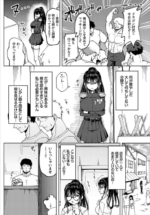 【エリート女がエロマッサージで堕ちるまでの一部始終…!】エロかわコミッカー・くろながすが贈る、強気ヒロインを極上テクで絶頂SEX!とある王国の騎士団団長を務める女騎士は、団員の男達の不甲斐なさにイライラしていた。任務が終わると男達のマッサージの話を耳にし、自分もたまには癒やされようとマッサージを受けに向かう。正体がバレないようお忍びで店へ行くと、頼りなさそうな店員が一人。そして渡された衣装に着替えると、布面積がかなり少ないマイクロビキニで!?