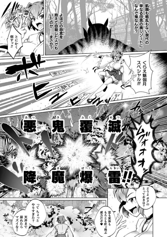 化け物が出たという廃リゾートに除霊に来た退魔師の末裔、マヤ。雑魚霊たちをあっさりと成仏させた彼女の匂いにつられて、平和な時代に見合わぬ力を持った鬼が現れる。マヤの最強の技にも耐えた鬼の反撃を受け、戦う術を失った彼女は奥の手――色仕掛けに打って出るのだった。巨乳を存分に活かし、媚びた態度で鬼の極太チンポに奉仕するマヤ。子宮まで貫かれてさらに乱れる彼女には、しかしまだ勝算があった。鬼をイかせて精気を吸い取ることで封印する秘奥義を隠していたのだ。膣内で射精させるべく、鬼の上で必死に腰を振るマヤだったが……?※『くっ殺ヒロインズVol.46』に掲載されている作品です。
