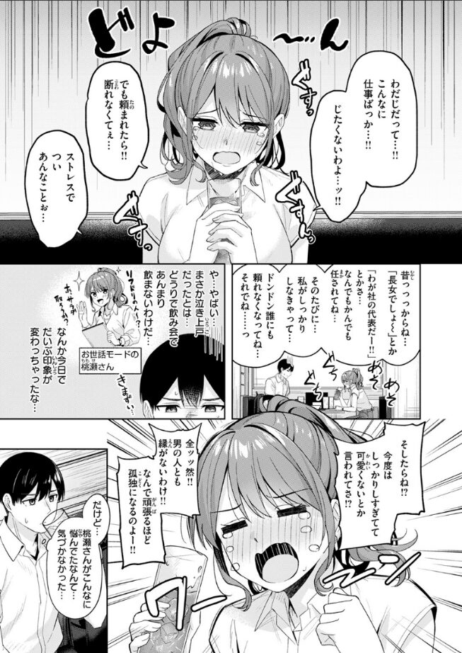 宇野(うの)くんの憧れの先輩、桃瀬(ももせ)さんの仕事ぶりは完璧超人で今日もかっこいい。別部署にまで頼られる彼女は今日もまた遅くまで残業。少しでも力になりたいと、宇野くんはオフィスに戻り――『ふふ…可愛い人ですね…もうぐちょぐちょに――』甘々エッチASMRを堪能している桃瀬さんの姿を目にしてしまう!?なんでも言うことを聞くから黙っててほしいと懇願してくる彼女に、宇野くんが頼んだお願い事は……♪
