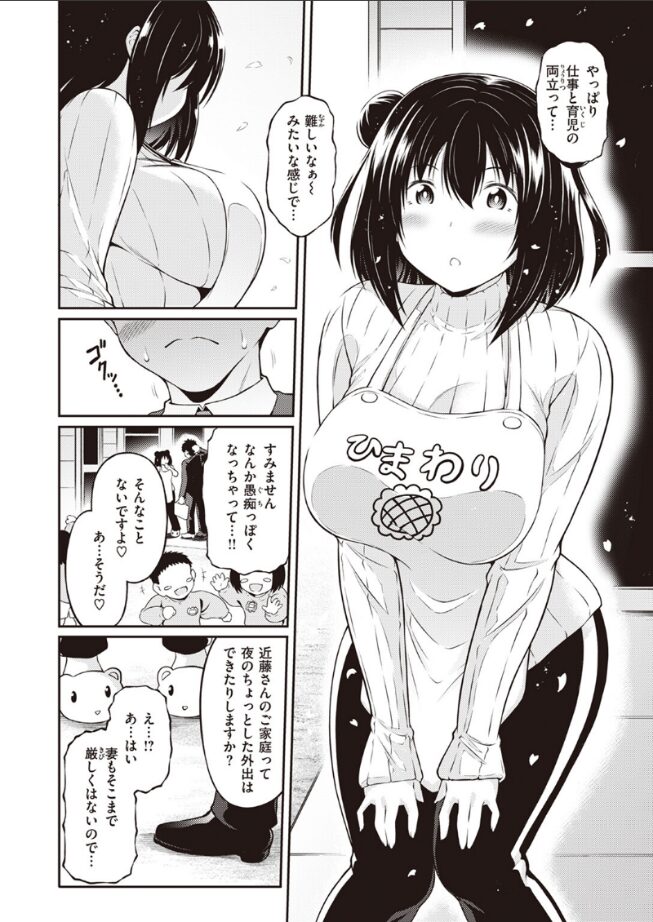 「今日は普段の『お疲れ』を…いっぱい癒してくださいね」保育士の前で、つい弱音をはいてしまった近藤(こんどう)。そんな近藤の≪疲れ≫に、ハナとマミがした提案とは……!?3P! パイズリ! ぶっかけ! 中出し! 優しい保育士たちと夢のような桃色展開……!!